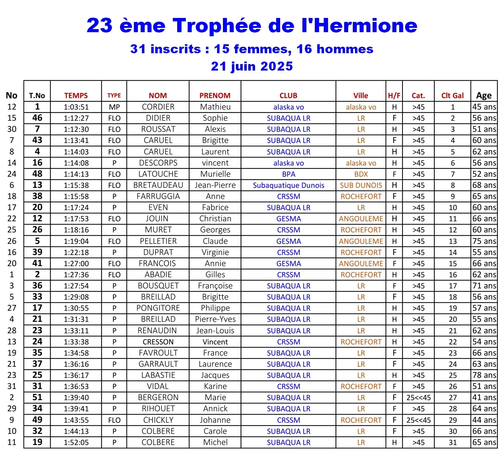 Le Trophée de l’Hermione est une compétition » open » qui n’est pas prise en compte dans le classement national individuel des compétiteurs et est donc ouverte à tous les types de nageurs (des plus « sérieux » aux plus « farfelus » !).