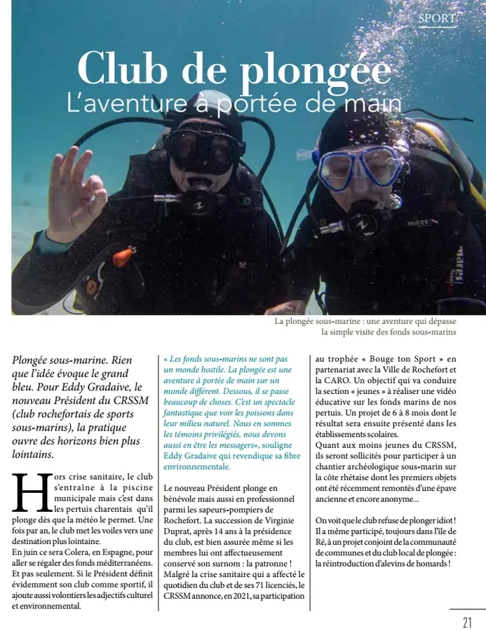 Club parmi les pionniers en Charente-Maritime, le Club Rochefortais des Sports Sous-Marins a été créé en l’été 1974 par de jeunes passionnés amoureux des merveilles sous-marines.